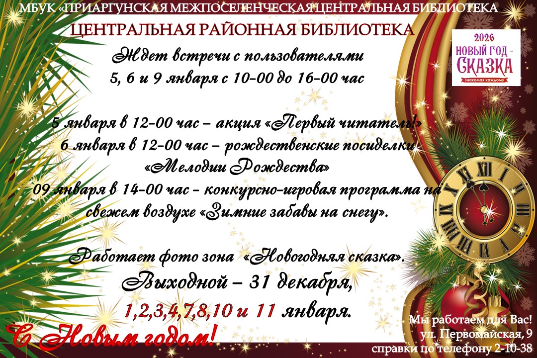 Адрес: п.Приаргунск, ул.Первомайская,9 Тел: 8(30243)2-10-38 E-mail: biblio_priarg@mail.ru График работы: пн-пт: с 8:00 до 18:00 часов, сб: с 8:00 до 16:00, вс - выходной